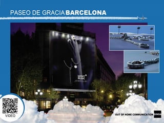 El documento presenta cuatro ubicaciones publicitarias disponibles en Madrid y Barcelona, incluyendo detalles sobre su ubicación, tráfico vehicular y peatonal, medidas, fechas de disponibilidad y tasas.