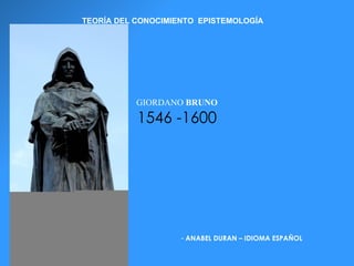 Giordano Bruno fue un filósofo italiano del siglo XVI que defendió ideas revolucionarias como la infinitud del universo y la existencia de otros mundos habitados. Fue encarcelado por la Inquisición y condenado a muerte por herejía debido a sus creencias no ortodoxas. Sus obras defendían la separación entre filosofía y religión y que la naturaleza, no el espíritu humano, refleja el poder divino. A pesar de sus aportes científicos, fue ejecutado por la hoguera en el a