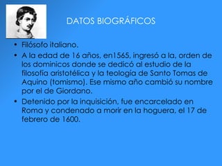 Giordano Bruno fue un filósofo italiano del siglo XVI que defendió ideas revolucionarias como la infinitud del universo y la existencia de otros mundos habitados. Fue encarcelado por la Inquisición y condenado a muerte por herejía debido a sus creencias no ortodoxas. Sus obras defendían la separación entre filosofía y religión y que la naturaleza, no el espíritu humano, refleja el poder divino. A pesar de sus ideas innovadoras, fue ejecutado en la hoguera en el año 1600 por o