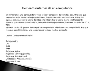 El documento describe los principales componentes internos de una computadora, incluyendo la tarjeta madre, la CPU, la memoria RAM, las tarjetas de video y de sonido, las unidades de almacenamiento como discos duros y ópticos, y la fuente de poder. Explica brevemente la función de cada uno de estos componentes clave y cómo interactúan para hacer funcionar la computadora.