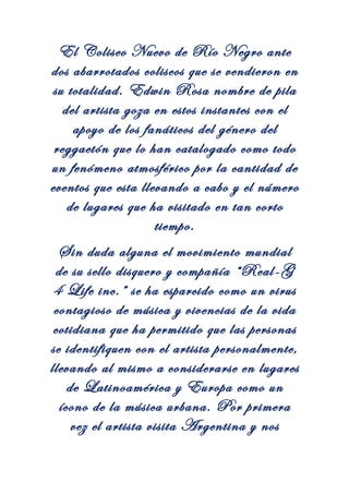 El artista de reggaetón Ñengo Flow se encuentra de gira mundial y visita Argentina por primera vez como parte de su gira "Real-G 4 Life Part. 2". Ñengo Flow ha tenido mucho éxito en sus conciertos recientes en Colombia y su sello discográfico se ha expandido como un "virus contagioso de música" en Latinoamérica y Europa. El artista se siente orgulloso del giro profesional que ha dado a su carrera mientras mantiene sus letras características.