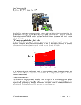 El documento describe lo que es un Sistema de Información Geográfica (SIG), explicando que permite mapear y analizar información con una componente geográfica para identificar patrones. Un SIG almacena datos geográficos en capas temáticas que pueden superponerse, y realiza tareas como el ingreso, manipulación, consulta y análisis de datos para apoyar la toma de decisiones. Los SIG son importantes para abordar problemas que tienen una dimensión geográfica crítica.