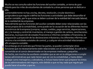 Las responsabilidades de un auxiliar contable pueden incluir tareas relacionadas con la contabilidad como el registro de transacciones, el manejo de inventarios y la preparación de informes financieros. Si bien el auxiliar contable no es responsable legal de la contabilidad, podría asumir responsabilidad penal o civil si sus acciones ilegales causan daños o si comete faltas graves a la ética profesional. Las responsabilidades de un auxiliar contable dependen de cada caso en particular.