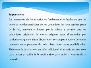 La Web 2.0 es la nueva forma de aprovechar la red permitiendo la participación activa de los usuarios a través de opciones que les dan voz propia en la web para administrar sus propios contenidos, opinar sobre otros y enviar y recibir información. La interacción de los usuarios es fundamental ya que les hace sentirse parte de la red y aumenta el interés en ella al permitir que los contenidos sean alimentados por particulares y se abran discusiones entre personas sobre temas comunes.