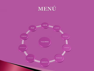 Este documento describe varios valores positivos como la sinceridad, la honestidad, la humildad, la caridad, la responsabilidad y el amor. Resalta la importancia de vivir con sinceridad y ser digno de confianza, reconocer tanto los defectos como las cualidades propias con humildad, y actuar con honestidad para tener integridad y evitar la hipocresía.