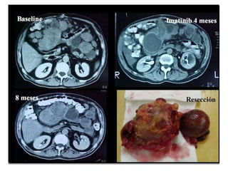 Este documento discute los tumores estromales gastrointestinales (GIST). Primero, explica que los GIST son los tumores no epiteliales más comunes del tracto digestivo y que su incidencia y agresividad fueron subestimadas durante mucho tiempo. Luego, resume los principales avances en el entendimiento y tratamiento de los GIST, incluyendo el descubrimiento de mutaciones genéticas clave, nuevas técnicas de diagnóstico e imatinib como un tratamiento efectivo. Finalmente, brinda recomendaciones sobre el tratamiento de GIST localizados,