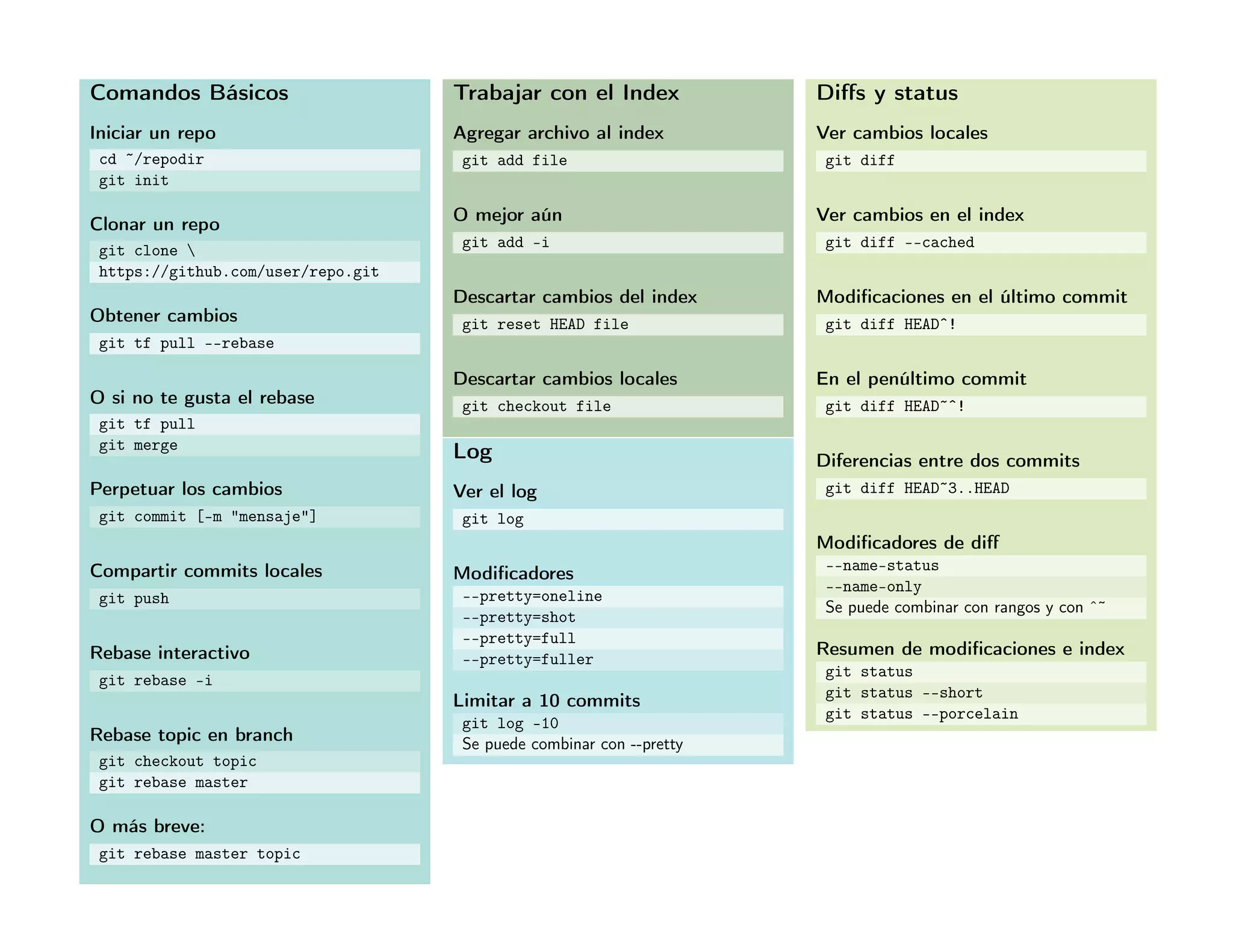 Este documento proporciona una introducción a los comandos básicos de Git como iniciar un repositorio (git init), clonar un repositorio existente (git clone), obtener cambios (git pull), realizar commits de cambios locales (git commit), compartir commits locales (git push), revisar el historial de commits (git log), ver diferencias en cambios (git diff), y obtener un resumen del estado del repositorio (git status). Explica cómo realizar un rebase interactivo (git rebase -i) y rebasear una rama de tema en otra rama principal (git rebase