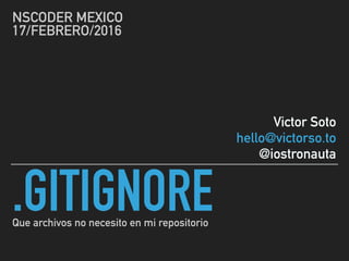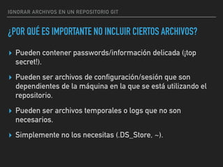Este documento explica cómo crear un archivo .gitignore para ignorar archivos que no se desean incluir en un repositorio Git, como archivos con contraseñas, archivos de configuración específicos de la máquina, archivos temporales o logs innecesarios. Describe las reglas y patrones que se pueden usar en el archivo .gitignore como *, ?, [], / y !, y proporciona enlaces a recursos adicionales sobre el uso de .gitignore.