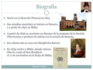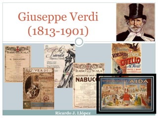 Giuseppe Verdi nació en 1813 en Italia. Estudió música y se convirtió en director de orquesta y profesor. En 1839 estrenó su primera ópera Oberto en La Scala de Milán. En 1840, con la ópera Nabucco encontró su estilo personal dramático que le dio gran éxito. Algunas de sus obras más famosas incluyen Rigoletto, La Traviata y Aida, la cual compuso en 1870 para la inauguración del Canal de Suez en Egipto. Verdi murió en 1901 si