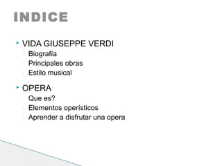 Giuseppe Verdi fue un compositor italiano de ópera nacido en 1813 que tuvo gran éxito con obras como Nabucco y Aida. La ópera combina música, literatura, drama y artes escénicas. Verdi contribuyó al desarrollo de la ópera con melodías sencillas y coros importantes, y narrando la historia musicalmente sin un esquema estricto.