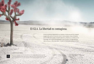 El documento describe las características del Mercedes-Benz GLA, un SUV compacto de gama alta. Ofrece un diseño deportivo y dinámico combinado con tecnología moderna de propulsión. Viene equipado con varios motores y opciones de transmisión. El interior proporciona comodidad y amplitud inusual para un vehículo compacto. También se describe una versión de alto rendimiento, el GLA 45 AMG 4MATIC.