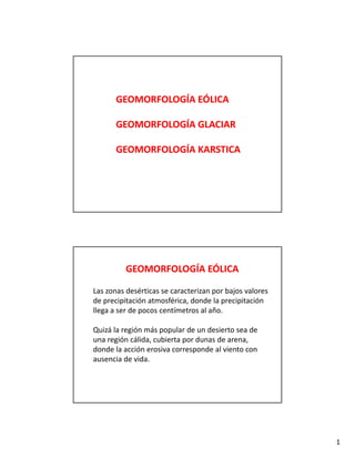 Este documento describe diferentes tipos de geomorfología, incluyendo geomorfología eólica, glaciar y kárstica. La geomorfología eólica incluye formas como dunas causadas por el viento. La geomorfología glaciar describe diferentes tipos de glaciares como casquetes polares, continentales y alpinos, y cómo su movimiento y erosión dan forma al paisaje. La geomorfología kárstica no se describe.