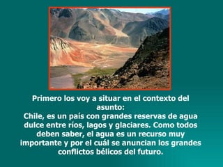El documento describe un proyecto minero llamado Pascua Lama que destruirá glaciares en Chile para extraer oro, plata y otros metales valuosos. Esto amenazará las fuentes de agua y medios de subsistencia de los agricultores locales, dejándolos sólo con agua contaminada. Además, los beneficios económicos del proyecto se destinarán principalmente a compañías extranjeras, no a Chile. Los agricultores se han estado oponiendo al proyecto por estos motivos.