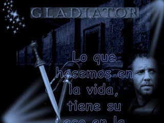 Este documento parece ser una colección de fragmentos de diálogos y pensamientos relacionados con la antigua Roma. Se mencionan gladiadores, el emperador Cómodo, y un personaje llamado Máximo Meridio que busca venganza por la muerte de su familia. Los fragmentos también discuten temas como el honor, la lealtad, y la libertad.