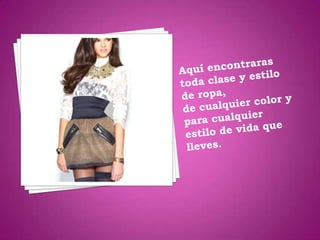 El documento habla sobre la importancia de la moda y la ropa para sentirse bien consigo misma. Recomienda que la ropa se ajuste al cuerpo de cada persona y la haga sentir cómoda y radiante, sin importar su talla u tipo de cuerpo. Además, menciona que los accesorios y la actitud pueden crear diferentes looks, y que es importante tener prendas básicas en el armario que siempre funcionen.