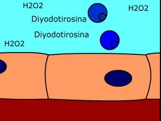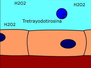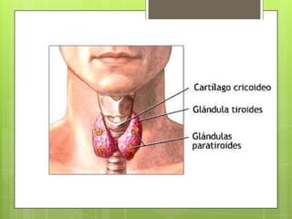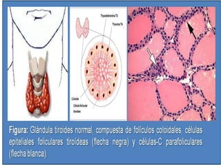 La glándula tiroides se encuentra en la parte frontal del cuello en forma de H, está formada por dos lóbulos unidos por un istmo. Produce las hormonas tiroxina y triyodotironina que regulan el metabolismo. Las células foliculares secretan estas hormonas, mientras que las células parafoliculares secretan la calcitonina para regular los niveles de calcio en sangre.