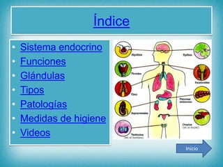 El documento proporciona información sobre el sistema endocrino, incluyendo sus funciones principales de regular el metabolismo, crecimiento y desarrollo, y reproducción a través de la secreción de hormonas. Describe las principales glándulas endocrinas como la hipófisis, tiroides, páncreas y sus hormonas. También cubre patologías como la diabetes y medidas de higiene para mantener un sistema endocrino saludable.