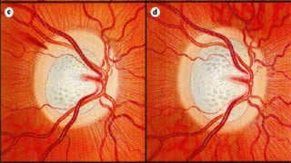 El documento resume la anatomía y fisiopatología del glaucoma. Explica que el glaucoma causa daño progresivo al nervio óptico debido a un aumento de la presión intraocular y clasifica los diferentes tipos de glaucoma, incluyendo el glaucoma primario de ángulo abierto, el glaucoma primario de ángulo cerrado y el glaucoma congénito. También describe los exámenes de diagnóstico y las opciones de tratamiento para cada tipo.