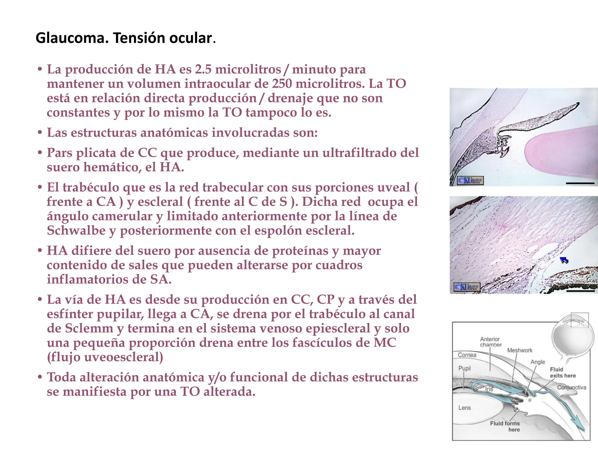 El documento aborda el glaucoma, centrándose en la tensión ocular (to) y su relación con la producción y drenaje del humor acuoso (ha). Se discuten los factores de riesgo como la edad, la raza y la miopía, así como diferentes métodos de tonometría y sus implicaciones en el diagnóstico y tratamiento de diversas formas de glaucoma, incluyendo la congénita y la inducida por corticoides. Además, se exploran aspectos genéticos asociados al glaucoma y su incapacidad para ser revertido una vez establecido.