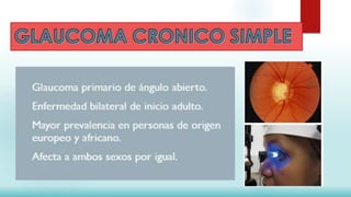 La neuropatía óptica adquirida, también conocida como glaucoma primario de ángulo abierto, se caracteriza por una excavación progresiva del nervio óptico y pérdida del campo visual que puede conducir a ceguera irreversible. Se cree que ocurre debido a un aumento de la presión intraocular que compromete el flujo axonal del nervio óptico o reduce el flujo sanguíneo a la cabeza del nervio, lo que causa daño y muerte neuronal progresiva. El tratamiento incluye medicamentos, láser trabeculopl