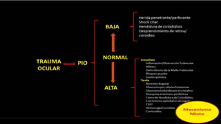 El glaucoma traumático es una condición compleja que resulta de diversos mecanismos patológicos tras traumatismos oculares, con una incidencia significativa, especialmente en jóvenes y ancianos. Se identifican diferentes tipos de glaucoma traumático y su manejo abarca tratamientos médicos y quirúrgicos, destacando la eficacia de la trabeculectomía con antimetabolitos. Las complicaciones pueden incluir incremento de la presión intraocular y glaucoma en el ojo contralateral, lo que requiere un seguimiento cuidadoso y un manejo apropiado.