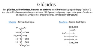 Los glúcidos son biomoléculas compuestas de carbono, hidrógeno y oxígeno que cumplen funciones energéticas estructurales en los seres vivos. La glucosa y el glucógeno almacenan energía mientras que la celulosa forma parte de las paredes celulares de las plantas. Los glúcidos incluyen monosacáridos como la glucosa, disacáridos como la sacarosa compuesta de glucosa y fructosa, y polisacáridos como el almidón y la celulosa.