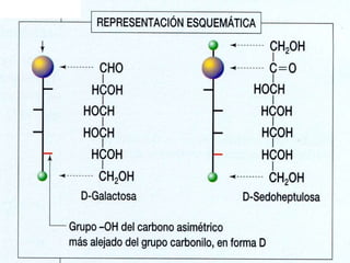 El documento proporciona información sobre los monosacáridos y sus propiedades. Explica que los monosacáridos son los glúcidos más simples, compuestos por cadenas de 3 a 7 átomos de carbono con grupos carbonilo y hidroxilo. Se describen diferentes tipos de monosacáridos como las triosas, tetrosas, pentosas y hexosas. También se explica la estereoisomería de los monosacáridos y cómo forman anillos cíclicos en disolución.