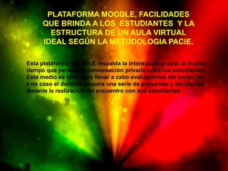 Este documento describe las características y estructura de una plataforma Moodle ideal según la metodología PACIE. Moodle permite la interacción grupal y conversaciones privadas entre estudiantes, y es útil para evaluaciones en línea. La estructura ideal incluye bloques para exposición de información, actividades de autocrítica, construcción del conocimiento, y comprobación del aprendizaje. La metodología PACIE usa la educación a distancia con apoyo de tecnología para generar una experiencia de aprendizaje cooperativo.