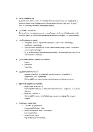 Este documento presenta un plan de investigación sobre el champú Glemo. El objetivo general es relanzar el champú Glemo al mercado y dirigirlo a personas mayores de 65 años. Para lograrlo, se necesita investigar las necesidades y percepciones de este grupo objetivo, así como las razones por las que el champú salió del mercado originalmente. El plan propone aplicar encuestas a personas mayores para conocer sus preferencias, y entrevistas a expertos como estilistas y la empresa Schwarzkopf para obtener información sobre el producto.