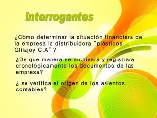 Este documento describe los objetivos de determinar la situación financiera de la empresa distribuidora de plásticos Glilajoy C.A. a través de archivar documentos cronológicamente, registrar movimientos diarios, sintetizar información contable en mayores de cuentas, y elaborar estados financieros para la junta directiva con el fin de administrar recursos efectivamente y cumplir medidas de seguridad industrial dentro de la empresa.