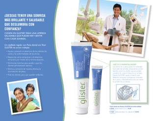 Este documento promociona varios productos de cuidado bucal de la marca Glister, incluyendo pasta dental, cepillos de dientes y enjuagues bucales. Explica que estos productos trabajan juntos para ayudar a prevenir caries, deterioro dental y enfermedades de las encías al eliminar efectivamente la placa y brindar protección con flúor. También promueve los beneficios de la remineralización de la pasta dental Glister para reparar el daño dental temprano.