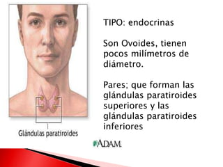 Este documento describe las glándulas paratiroides, incluyendo su ubicación, estructura, función y tipos de células. Las glándulas paratiroides secretan la hormona paratiroidea (PTH), la cual regula los niveles de calcio y fósforo en la sangre. El documento también explica las condiciones de hiperparatiroidismo y hipoparatiroidismo.