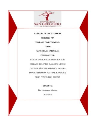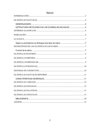Este documento describe las glándulas salivales mayores y menores. Las glándulas salivales mayores son la parótida, submaxilar y sublingual. Las menores incluyen las glándulas labiales, palatinas, genianas y linguales. Describe la estructura histológica de los acinos, conductos y estroma glandular de las glándulas salivales, así como su inervación simpática y parasimpática. La función principal de las glándulas salivales es la producción y secreción de la saliva en la cavidad bucal.