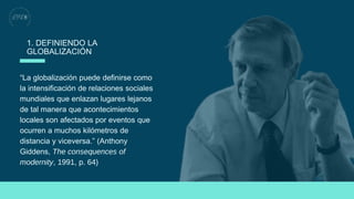 Este documento define la globalización como el aumento de las relaciones sociales entre lugares distantes que conectan eventos locales con eventos lejanos. Explica que la globalización se ha desarrollado en tres etapas: la primera globalización durante la expansión europea, la segunda con la revolución industrial y el colonialismo europeo, y la tercera desde la segunda mitad del siglo XX impulsada por avances tecnológicos. También analiza los impactos de la globalización actual como mayores desigualdades y el debilitamiento de las identidades nacional