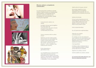 Este documento describe los conceptos clave de la comunicación intercultural y ofrece consejos para lograr una comunicación efectiva entre culturas diferentes. La comunicación intercultural involucra la interacción entre dos o más culturas y es importante en actividades como el turismo cultural. Para lograr una comunicación eficaz, se debe evitar los estereotipos, prestar atención al contexto y crear igualdad entre los participantes.