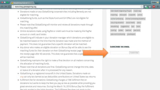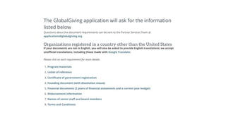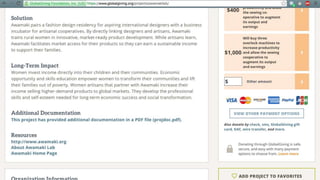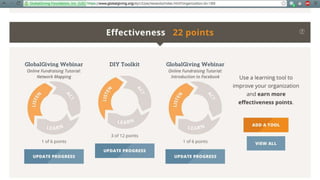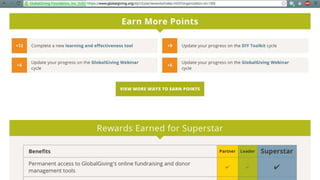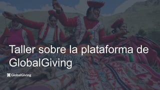 Este documento presenta una agenda para un taller sobre el uso de la plataforma de GlobalGiving para mejorar la recaudación de fondos en línea. El taller incluye sesiones para conocerse unos a otros, aprender sobre las nuevas funciones de GlobalGiving como GG Rewards, crecer las redes de donantes, y contar las historias e impacto de las organizaciones. El objetivo es ayudar a las organizaciones a ser más efectivas en la recaudación de fondos y en general como organizaciones.