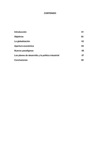 El documento resume los objetivos y contenidos de un trabajo académico sobre la política industrial y comercial de Colombia. El trabajo analiza el impacto de la apertura económica de los años 90 en la industria colombiana, evalúa las propuestas actuales del gobierno y plantea una estrategia alterna de desarrollo industrial. El documento también explora conceptos como la globalización y analiza cómo la aplicación de la teoría de ventajas comparativas ha afectado a países como Colombia.