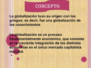 El documento define la globalización como un proceso histórico resultado de la innovación humana y el progreso tecnológico que ha llevado a la integración de las economías a nivel mundial a través del mercado capitalista global. Explica que factores como la tecnología, la comunicación y el transporte han impulsado la globalización al reducir las barreras políticas y expandir los mercados más allá de las fronteras nacionales. Finalmente, señala que la globalización tiene tanto ventajas como desventajas para los países y regiones