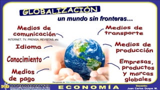 El documento describe el proceso de globalización y sus dimensiones culturales, sociales, políticas, tecnológicas y económicas. Explica cómo la globalización ha llevado a una mayor integración mundial a través de la eliminación de barreras comerciales, y cómo esto ha creado tanto oportunidades como desafíos para los países y empresas al exponerlos a una mayor competencia internacional.