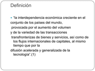 La globalización es el creciente grado de interdependencia entre los países del mundo a través del aumento del comercio internacional y los flujos financieros. Este proceso tiene implicaciones económicas, políticas, sociales y culturales significativas. Afecta a los países en desarrollo de diferentes maneras, trayendo tanto beneficios como efectos adversos. El documento analiza cómo la globalización ha impactado a estas naciones y provee fuentes de información sobre el tema.