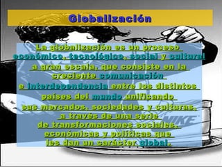La globalización es un proceso a gran escala que consiste en la creciente comunicación e interdependencia entre los países del mundo a través de transformaciones sociales, económicas y políticas que unifican sus mercados, sociedades y culturas dándoles un carácter global. Este proceso incluye aspectos económicos, tecnológicos, sociales y culturales.