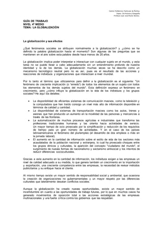 La globalización ha conectado a las personas y empresas de todo el mundo a través de sistemas de comunicación y transporte más eficientes. Esto ha creado nuevas oportunidades comerciales pero también ha generado incertidumbre laboral e impactos culturales y ambientales. Los gobiernos y empresas deben adaptarse a este entorno globalizado, mientras que los países más débiles enfrentan mayores desafíos de integración económica e inversión extranjera. La brecha entre países ricos y pobres se ha ampliado como resultado de la