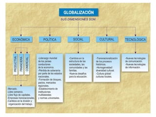 El documento describe la globalización como el proceso de intensificación de las relaciones económicas internacionales en las últimas décadas. Las empresas, los gobiernos y las organizaciones internacionales operan cada vez más en un mercado mundial y una economía globalizada debido al desarrollo de las telecomunicaciones, el transporte y las políticas liberales. Sin embargo, la globalización también ha generado desigualdades y problemas sociales y ambientales.