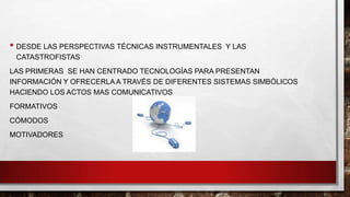 Este documento discute varios temas relacionados con la tecnología y la sociedad. Argumenta que aunque la tecnología puede facilitar la comunicación y la distribución de información, también puede usarse para manipulación cultural y sometimiento. Plantea que la tecnología no determina la historia por sí sola, sino que existe una relación de interdependencia con la sociedad. Finalmente, cuestiona tres mitos comúnmente asociados con las TIC: que la red proporciona abundancia, transparencia y equidad de información para todos, cuando en realidad