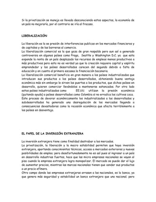 GLOBALIZACIÓN <br />Joseph E. Siglitaz se basa en sus experiencias como docente, en su trabajo en la casa blanca, en el banco mundial etc. Para concluir que la globalización ha generado un impacto negativo en los países en desarrollo y principalmente sobre la población vulnerable de estos. <br />El cree que si se replantea el concepto de globalización, se suprime el libre comercio, se trabaja más sobre la integración de las economías nacionales y el estado se hace más eficiente y sensible; la economía se puede volver a favor de todos los sectores de la sociedad; es decir que los gobiernos y grandes capitalistas dejen de formular soluciones que beneficien sus intereses y que sean más objetivos y busquen beneficios para la sociedad en general.<br />¿LIBERTAD DE ELEGIR?<br />Los gobiernos deberían dejar el manejo de empresas de servicio público en manos del sector privado (privatización) para dar espacio a buscar soluciones en el área fiscal.<br />PRIVATIZACIÓN<br />La privatización puede ser la solución para que el estado se centre en los temas que realmente le completen; para que esta funcioné es necesario tener en cuenta unas precondiciones que deben ser satisfechas antes de pretender que la privatización pueda contribuir al crecimiento económico.<br />En primera medida la privatización debe hacerse concienzudamente y sin afanes para evitar fracasos ya que se debe tener en cuenta que no todas las empresas privadas están dispuestas a garantizar la oferta; por otro lado los mercados surgen para satisfacer cualquier necesidad y no con la finalidad de proveer servicios esenciales.<br />Un ejemplo de otro problema es que en EE.UU. se crea la asociación Nacional Federal de Hipotecas ya que el sector privado no les facilita este servicio a familias de ingresos medios y bajos. <br />Hay que tener en cuenta la protección del empleo que garantice a los empleados una estabilidad laboral y evite grandes masas de desempleados, generando otro problema social como violencia urbana, delincuencia, deserción escolar para engrosar las filas del rebusque y reforzar el sostén familiar y como si los aspectos ya mencionados fueran poco también se debe tener en cuenta la “la búsqueda de rentas” por parte de aquellos funcionarios que buscan beneficio propio a partir de las empresas publicas u ofrecen contratos y empleos a sus amigos y familiares.<br />Si la privatización se maneja es llevada desconociendo estos aspectos, la economía de un país no mejoraría, por el contrario se iría al fracaso.<br />LIBERALIZACIÓN<br />La liberación es la se presión de interferencias publicas en los mercados financieros y de capitales y de las barreras al comercio.<br />La liberalización comercial es la que goza de gran respaldo pero aun así a generado controversia en algunos países como Praga, Seattle y Washington D.C. ya que esta expande la renta de un país desplazado los recursos de empleos menos productivos a más productivos pero esto no es verdad ya que la creación requiere capital y espíritu emprendedor y los países desarrollados carecen del segundo debido a falta de educación y en cuanto al primero escasea la financiación bacanaria.<br />La liberalización comercial beneficia en gran manera a los países industrializados que introducen sus productos a los países desarrollados, obteniendo buena ventaja económica más sin embargo le sirven las puertas a los productos, que dichos países en desarrollo, quieren comerciar llevándolos a mantenerse estancados. Por otro lado estos países industrializados como EE.UU. utilizan la presión económica (quitando ayuda) a países desarrollados como Colombia si no erradica los cultivos coca.<br />Este proceso de devorar económicamente los industrializados a los desarrollados y subdesarrollados ha generado una desregulación de los mercados llegando a consecuencias devastadoras como la recesión económica que afecta terriblemente a los países en desventaja.<br />EL PAPEL DE LA INVERSIÓN EXTRANJERA <br />La inversión extranjera tiene como finalidad destrabar a los mercados.<br />La privatización, la liberación y la macro estabilidad permiten que haya inversión extranjera, aportando conocimientos técnicos, acceso a mercados exteriores y nuevas posibilidades de empleo; pero desafortunadamente no es así pues al ingresar a un país en desarrollo industrias fuertes, hace que las micro empresas nacionales se vayan al piso cuando la empresa extranjera logra monopolizar. El mercado se puede dar el lujo de aumentar precios, mientras las marcas nacionales tienen que vender sus productos a un precio efímero. <br />Otro campo donde las empresas extranjeras arrasan a las nacionales, es la banca, ya que genera más seguridad y estabilidad un banco extranjero que uno nacional; pero surge un gran problema, el banco extranjero solo financia y apoya a grandes empresas, llevando a su fin a aquellas empresas que empiezan a surgir.<br />Otro punto vulnerable para los bancos nacionales es que pueden expandir los créditos cuando la economía necesita un estimulo pero tienen que contraerlos cuando aparecen signos de recalentamiento, lo cual no pasa con la banca extranjera.<br />Pero el campo financiero no es el único afectado, a este les soporta los sobornos de inversionistas extranjeros a los gobiernos para que concedieran privilegios especiales, como protección arancelaria.<br />Todos estos problemas surgieron por la intervención de las instituciones financieras, lo cual no pretendía el FMI pues este buscaba. Con la inversión extranjera generar empleo, eliminar la intervención pública, reducir impuestos, contener la inflación, pero todo se quedo en buenas intensiones.<br /> SECUENCIAS Y RITMOS <br />Las políticas del consenso de Washington se funda en un médelo simplista de la economía de mercado, el modelo del equilibrio competitivo, en el cual la mano invisible de Adam Smith opera y lo hace a la perfección.<br />Adam plantea la id