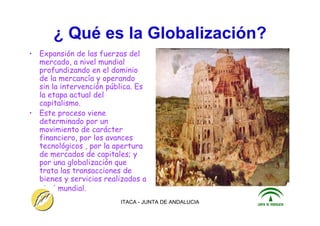 El documento describe los conceptos de globalización, sus causas y efectos. Explica que la globalización implica la expansión de las fuerzas del mercado a nivel mundial y profundiza el dominio de la mercancía. También describe las entidades que apoyan la globalización como el FMI, el Banco Mundial y la OMC. Finalmente, detalla una serie de riesgos asociados con la globalización como crisis financieras, pérdida de diversidad cultural, deterioro ambiental y aumento de la desigualdad y la pobreza.
