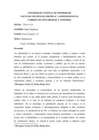 El documento analiza el concepto de globalización, sus causas, tecnología y aplicación. Explica que la globalización es un proceso económico, político y cultural a escala global que une mercados, sociedades y culturas a través de transformaciones sociales, económicas y políticas. Entre sus causas se encuentran la reestructuración geopolítica después de la Guerra Fría, la apertura de mercados y la revolución de la información. La tecnología ha facilitado la conectividad y la libre circulación. Algunos