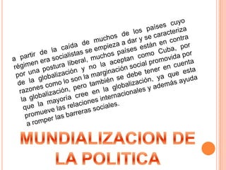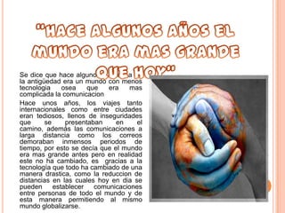 El documento describe cómo la tecnología ha reducido las distancias y mejorado las comunicaciones entre personas de todo el mundo, permitiendo la globalización. Antes, los viajes y las comunicaciones a larga distancia eran más difíciles y lentas, pero ahora gracias a Internet y otras tecnologías, las personas pueden comunicarse y compartir información casi instantáneamente a nivel global.