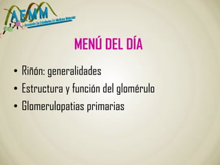 El documento presenta información sobre la anatomía y función del riñón, incluyendo la estructura del glomérulo y las nefronas. Describe la microestructura del glomérulo, incluyendo la capa endotelial, la membrana basal glomerular y los podocitos. También explica factores que determinan la filtración glomerular como la presión hidrostática y la osmótica, así como el mecanismo de autorregulación del flujo sanguíneo renal.