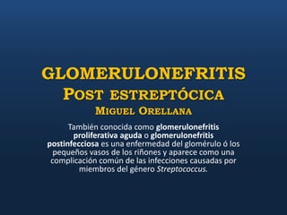 La glomerulonefritis postestreptocócica es una enfermedad de los riñones que ocurre como complicación de infecciones por estreptococos del grupo A. Los síntomas aparecen 1-4 semanas después de la infección y se debe a una reacción inmune anormal contra antígenos bacterianos. Los principales agentes causales son los estreptococos del grupo A, aunque también pueden estar involucrados otros microorganismos.